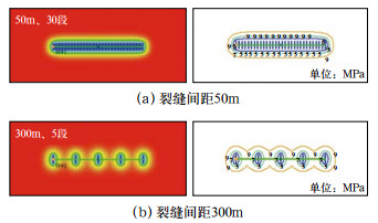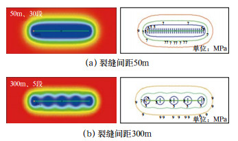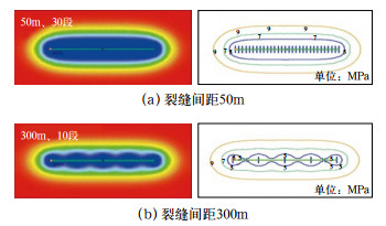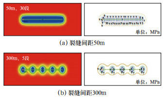 图 9 Ⅱ型煤层不同裂缝间距时的压力场云图(左)及等值线图(右) Fig. 9 Schematic pressure field cloud (left) and contours (right) of different fracture spacings for type Ⅱ coal seam |
