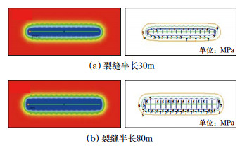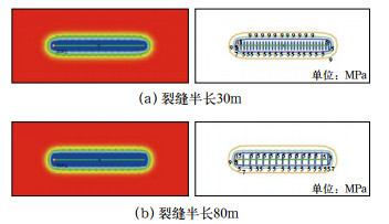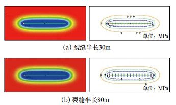 图 14 Ⅱ型煤层不同裂缝半长时的压力场云图(左)及等值线图(右) Fig. 14 Schematic pressure field cloud (left) and contours (right) of different fracture half-lengths for type Ⅱ coal seam |