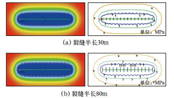 图 16 Ⅳ型煤层不同裂缝半长时的压力场云图(左)及等值线图(右) Fig. 16 Schematic pressure field cloud (left) and contours (right) of different fracture half-lengths for type Ⅳ coal seam |