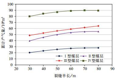 从图 17中可以看到,裂缝半长越大,生产10年后的累计产气量越高,但当裂缝半长达到一定长度后,累计产气量趋于稳定,这与前期定排液量生产有关; 不同煤层性质条件下累计产气量趋于稳定的拐点存在差异,其对于累计产气量的影响也十分明显; 对于厚度小、渗透率高的Ⅲ型煤层,裂缝半长越长越好; 其他类型煤层裂缝半长在60m左右即可。