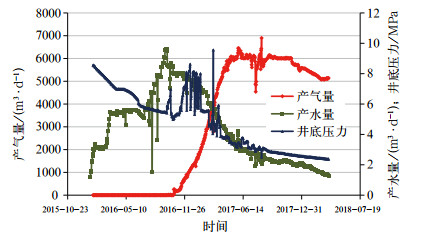 截至2018年4月,TP1井仍然保持了较高的产气量,整体生产效果明显强于煤层气直井,说明各压裂段之间形成了面积降压区域,气体解吸量较大,供气能力较强。