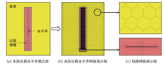 2.3 模型求解 2.3.1 网格划分采用非结构化PEBI网格对求解区域进行网格划分,各网格中心节点与相邻网格中心节点的连线与交界面垂直,并在井和裂缝周围进行网格加密处理,如图 2所示。