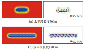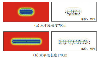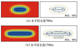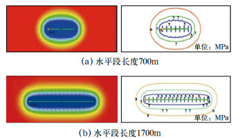 图 6 Ⅳ型煤层不同水平段长度时的压力场云图(左)及等值线图(右) Fig. 6 Schematic pressure field cloud (left) and contours (right) of different horizontal sections for type Ⅳ coal seam |