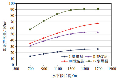 从图 7中可以看到,水平段长度越长,生产10年后的累计产气量越高,但当水平段长度达到一定程度后,累计产气量趋于稳定,并且不同煤层类型条件下累计产气量趋于稳定的拐点存在差异。此外,不同煤层条件对于累计产气量的影响也十分明显,对于厚度小、渗透率高的Ⅲ型煤层,水平段长度越长累计产气量越大; 其他类型煤层水平段长度均可控制在1300m以下。由于厚度小、渗透率低的Ⅰ型煤层产量很低,考虑到压裂水平井成本很高,这种煤层条件下建议不采用压裂水平井技术。