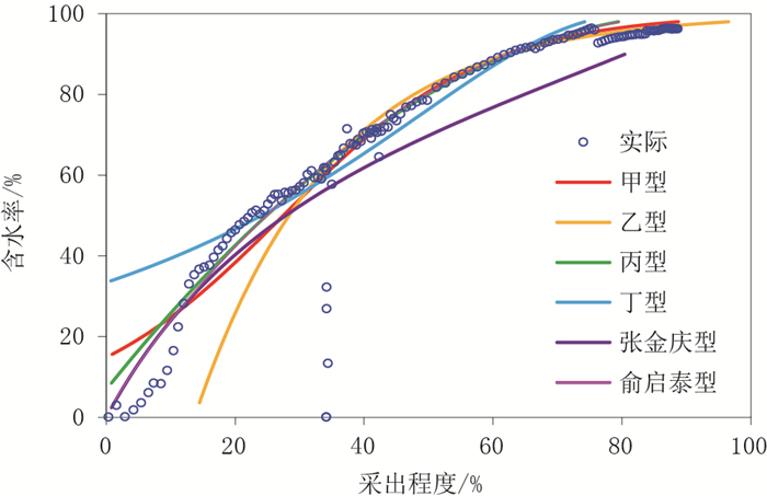通过分析南海西部多个典型油藏的含水率上升规律发现,对于无水采油期长的油田,含水率上升规律与俞启泰型和甲型水驱曲线符合,与丙型、丁型、乙型和张金庆水驱曲线不符合;对于无水采油期短的油田,含水率上升规律与丙型和俞启泰型水驱曲线符合,与甲型较符合,与乙型、丁型和张金庆型不符合。总体来看,俞启泰型水驱曲线适用范围更广,符合程度占77%以上(图 3),所以推荐采用该方法计算可动油储量和技术可采储量。