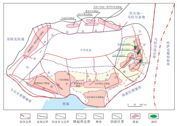 图 1 滨里海盆地构造单元划分 Fig. 1 Division of structural units in the Precaspian Basin |