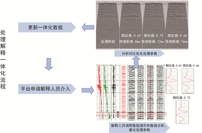 项目运行过程中,当处理环节需要解释人员介入时,处理人员可通过平台申请,在数据湖中更新一体化数据,解释人员通过平台下载数据,也可登录远程处理服务器协同研究。以反褶积处理解释结合点为例(图 2),解释人员通过平台数据湖,调取所需井数据和以往解释成果等,制作合成记录,采用处理人员更新的不同参数反褶积结果进行井标定,求取相关系数,定量分析不同参数反褶积效果,得出最优参数,并反馈到平台。处理人员通过平台获取解释人员优化参数,再用于定性定量分析的进一步优化处理中,确保处理成果高质量的同时,保障项目研究成果的高质量(图 3)。特别是针对多轮次的中间成果,解释人员提前介入,可以做到问题早发现、数据早整改、成果早应用,确保项目质量和按期交付。