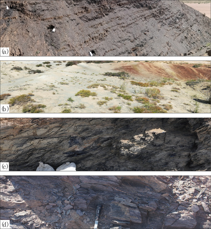 图 3 银额盆地及周缘不同层系暗色泥岩野外露头照片 Fig. 3 Field outcrop photos of dark mudstones of various formations in Yingen-Ejinaqi Basin and its peripheral areas |