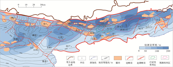 盆地经历了3期构造运动,分别是石炭纪—早二叠世的裂谷张性应力期、中二叠世—早三叠世的断陷—断坳转化期和中三叠世至今的类前陆挤压坳陷期。在这3期构造运动的影响下,依据地层的构造应力性质和沉积充填特点,可将盆地划分为三大构造层,分别为石炭系—下二叠统的断陷构造层、中二叠统—下三叠统的断陷—坳陷复合构造层和中三叠统以上地层以南北向挤压冲断为主的类前陆坳陷和前陆褶皱冲断构造层。每个构造层都有各自独特的隆—坳格局,控制着不同时期的生烃凹陷分布[5],现今的构造单元基于中三叠统以上地层格局为基础而划分。受燕山期和喜马拉雅期构造运动的影响,盆地内多发育逆冲断层、滑脱断层及走滑断层,对本区的油气成藏起到了重要影响作用。