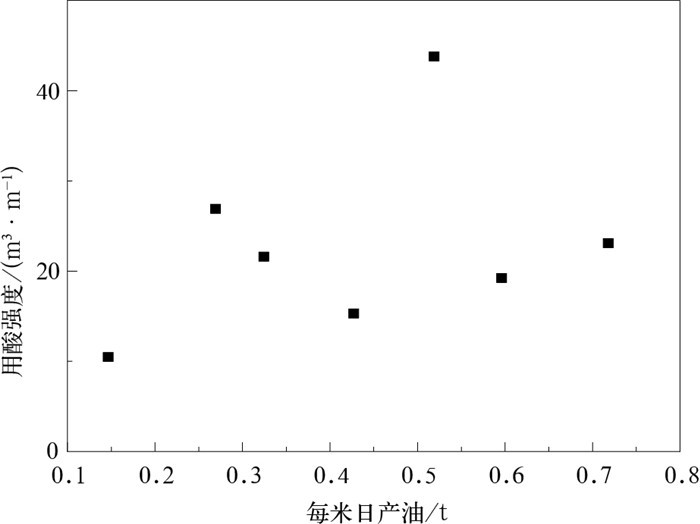 图 13 压裂后每米日产油与用酸强度的关系图 Fig. 13 Relationship between oil rate per meter and fracturing acid intensity |
