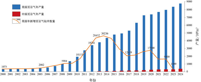 图 1 中美页岩气年产量对比图 Fig. 1 Comparison of annual shale gas production between China and the United States |
