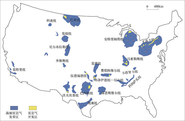 图 2 美国页岩气田分布图(据文献[16]修改) Fig. 2 Distribution of major shale gas fields across the United States (modified after reference [16]) |