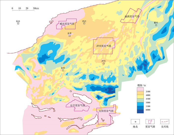 图 3 川南地区五峰组—龙马溪组页岩气田埋深图 Fig. 3 Burial depth contour of Wufeng-Longmaxi formation shale gas reservoir in Southern Sichuan Basin |