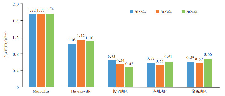 图 6 美国与川南典型页岩气千米EUR对比图 Fig. 6 Comparison of per kilometer EUR of typical shale gas wells between the United States and Southern Sichuan Basin |
