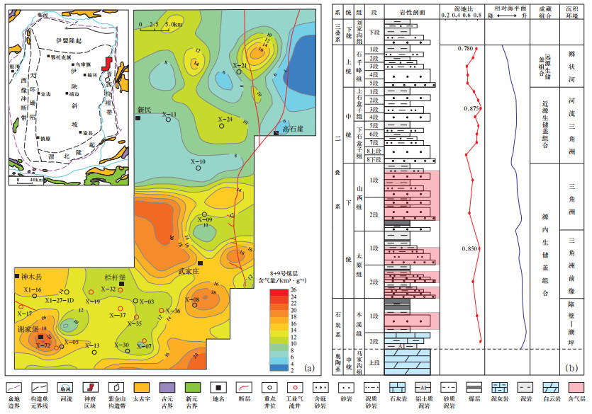 1 研究区勘探概况神府区块位于鄂尔多斯盆地东北部的边缘地带,在构造位置上,横跨伊陕斜坡东北部和晋西挠褶带北部,与神木、大牛地两个大气田相邻,构造较为简单,整体呈现北高南低,东高西低的北东方向抬升的单斜构造[21-22](图 1a)。该区勘探主力层为上古生界致密砂岩层,自下而上发育本溪组、太原组、山西组、下石盒子组、上石盒子组和石千峰组,沉积演化从海陆过渡相转向陆相,沉积厚层的砂岩,发育低产、特低丰度、中浅层、特大型致密砂岩气藏,具有较大的勘探潜力[23-24]。神府区块主要含气层位为山西组二段、太原组一段、太原组二段和本溪组一段。其中,本溪组主要发育障壁—潮坪相,太原组主要发育浅水三角洲相(图 1b),岩性主要为岩屑砂岩,孔隙度主要变化范围为4%~10%,渗透率主要集中在0.1~0.45mD之间,含气饱和度在43%~68%,试气效果良好。2022年在神府区块中南部以本溪组、太原组为目标层系完钻探井20口,探明砂岩致密气储量200×108m3,2023年加大神府区块东南部砂岩气勘探,落实探明天然气储量超100×108m3。四年来临兴—神府新增天然气探明—控制储量约为900×108m3,由2019年探明储量约为2000×108m3上升到2023年约为2800×108m3,实现跨越式增长,进一步深化勘探的潜力巨大。