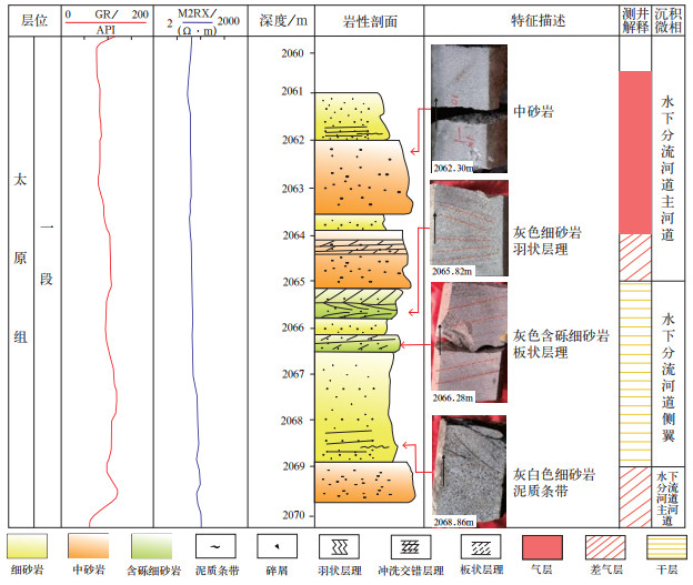 太原组三角洲前缘水下分流河道多发育中砂岩和细砂岩,粒度自下而上逐渐变细、交错层理发育,测井曲线形态呈箱形和钟形。神府地区X1-39井取心井段沉积微相分析表明(图 11),主要发育两期水下分流河道,间夹分流河道侧翼沉积。水下分流河道岩性主要为灰色—灰白色中砂岩、细砂岩,偶夹泥质条带,发育羽状、板状交错层理,对应的孔隙度平均为9.3%,渗透率平均为0.049mD;河道侧翼主要岩性为灰色含砾细砂岩,具有板状层理,对应的孔隙度平均为6.7%,渗透率平均为0.016mD,三角洲前缘水下分流河道沉积微相砂岩的孔渗性与含气性较河道侧翼均较好,表明水下分流河道是太原组沉积储层的主要发育有利区。