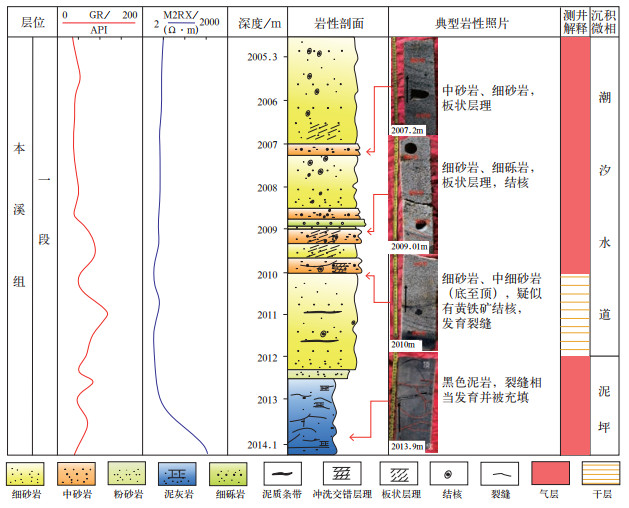 本溪组潮汐水道岩性主要为中砂岩、中细砂岩以及细砂岩,粒度自下而上逐渐变粗,具有反旋回粒序特点,主要发育羽状交错层理、板状层理,测井曲线形态主要为箱形和钟形。由图 12可知,取心井段主要发育一期潮汐水道与泥坪沉积微相。潮汐水道岩性主要为深灰色—灰色中砂岩、灰色中细砂岩及细砂岩,发育裂缝以及黄铁矿结核,具有板状层理和羽状交错层理,对应的孔隙度平均为10.8%,渗透率平均为0.81mD,且具有较好的含气性特征,继而可以确定潮汐水道是研究区本溪组沉积储层的有利发育区。