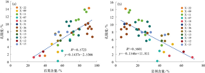 图 13 鄂尔多斯盆地神府地区致密砂岩孔隙度与石英(a)、岩屑含量(b)关系图 Fig. 13 Relationship between porosity of tight sandstone and quartz content (a) and lithic content (b) in Shenfu block, Ordos Basin |