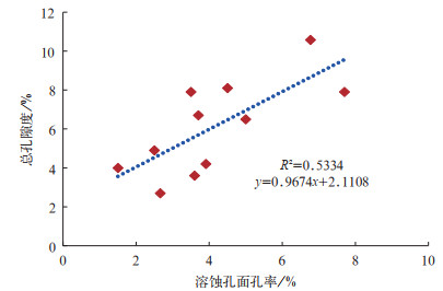 与压实、胶结作用不同的是,溶蚀作用会改善储层物性。研究区煤系烃源岩已经处于成熟—高成熟阶段,在生烃热演化过程中会产生大量的有机酸,溶蚀太原组和本溪组砂岩储层,形成大量的溶蚀孔隙。通过选取研究区目的层典型井样品结合PACS软件统计其溶蚀孔面孔率并绘制相关关系图(图 14),发现溶蚀孔面孔率与总孔隙度之间存在明显的正相关性,表明溶蚀作用形成的次生溶蚀孔一定程度上促进了储层总孔隙度增长。斜长石与岩屑等溶蚀矿物对溶蚀作用具有重要影响,根据全岩衍射实测结果发现,研究区目的层斜长石含量低,而岩屑含量较高,笔者通过统计分析发现,岩屑含量与其孔隙度之间存在着一定的负相关关系,随着岩屑含量的逐渐降低,样品孔隙度明显增加(图 13b),表明岩屑溶蚀作用产生的溶蚀孔隙是储层孔隙度的主要组成部分。