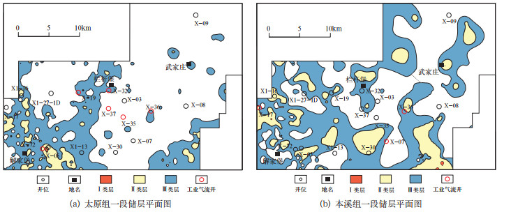 根据神府地区的储层分类标准,对储层的分布进行了分类评价(图 15)。研究区以Ⅲ类储层分布最广,其次为Ⅱ类储层,而Ⅰ类储层仅为零星分布,其分布占研究区面积的3%~7%,Ⅱ类储层占10%~30%。太原组一段的Ⅱ类有利储层区块主要集中在解家堡东南部,受到水下分流河道的控制(图 15a);本溪组的Ⅱ类有利储层区块则相对连续,连片式集中在栏杆堡南部及东南部等潮道发育地区,受到潮道的控制(图 15b)。整体而言,从平面上来看,研究区有利储层主要沿水下分流河道和潮道发育。沉积相控制着主要厚层砂体的展布,从而控制了优质储层的分布和发育情况,两者之间有着十分良好的对应关系。