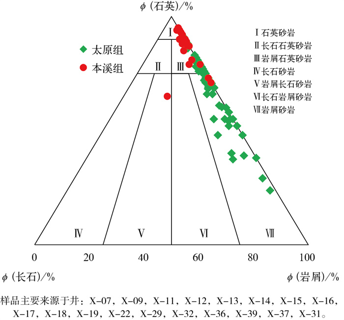 通过对神府地区X-07,X-09,X-11等18口井太原组与本溪组岩石样品的铸体薄片镜下鉴定分析,储层主要岩石类型有岩屑砂岩、长石岩屑砂岩和岩屑石英砂岩;本溪组石英含量高,而太原组长石含量相对较高,石英含量减少,岩屑含量增加。其中,本溪组储层主要发育石英砂岩、岩屑石英砂岩(图 2),成分成熟度相对较高,石英相对含量主要集中分布在79%~95%之间,岩屑含量分布在5%~29%之间,岩屑主要以变质岩岩屑和沉积泥质岩屑为主;长石含量相对较少,显示出贫长石特征,所含黏土矿物种类丰富,主要发育伊利石和高岭石。太原组储层岩石类型以岩屑砂岩为主,其次为长石岩屑砂岩和岩屑石英砂岩,含有少量的长石砂岩和石英砂岩(图 2);相对本溪组,岩石成分成熟度偏低,石英含量为34%~88%,岩屑含量为11.9%~52%,主要以变质岩岩屑为主,其次为岩浆岩岩屑和少量云母及泥岩岩屑;长石含量较本溪组有所增加。此外,太原组钾长石多发生高岭石化,高岭石含量增加,高岭石伊利石化大量发生,伊利石含量相应增加,黏土矿物以伊利石和高岭石为主,还发育少量的伊/蒙混层。