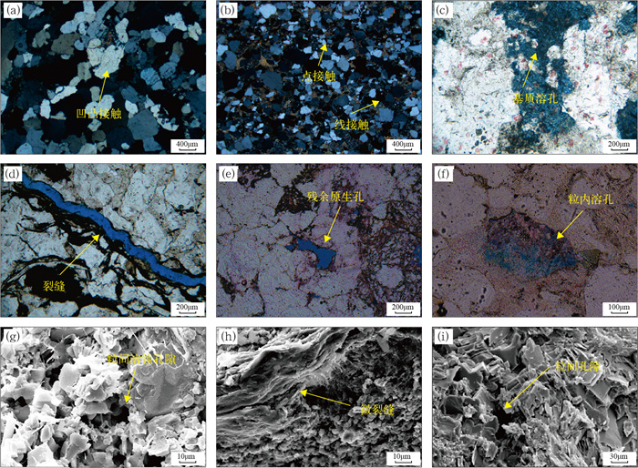 图 3 鄂尔多斯盆地神府区块太原组—本溪组主要孔隙特征图片 Fig. 3 Microscopic photos of main pore types in Taiyuan Formation-Benxi Formation in Shenfu block, Ordos Basin (a)X-24井,1885.65m,本溪组,颗粒间凹凸接触,铸体薄片,25×;(b) X1-11-1D井,2121.26m,太原组,颗粒间点—线接触,铸体薄片,12.5×;(c) X-17井,2071.3m,太原组,基质溶孔,铸体薄片,50×;(d) X-17井,2106.55m,本溪组,微裂缝,铸体薄片,50×;(e) X-36井,2036.02m,本溪组,残余原生孔隙,铸体薄片,50×;(f) X-36井,1970.18m,太原组,粒内溶孔,铸体薄片,100×;(g) X-07井,2005.5m,本溪组,粒间溶蚀孔隙中充填鳞片状高岭石和丝片状伊利石,扫描电镜;(h) X-09井,1794.81m,太原组,长石沿解理溶蚀产生微裂隙,扫描电镜;(i) X-38井,2236.42m,本溪组,粒间孔隙内充填鳞片状高岭石,扫描电镜 |