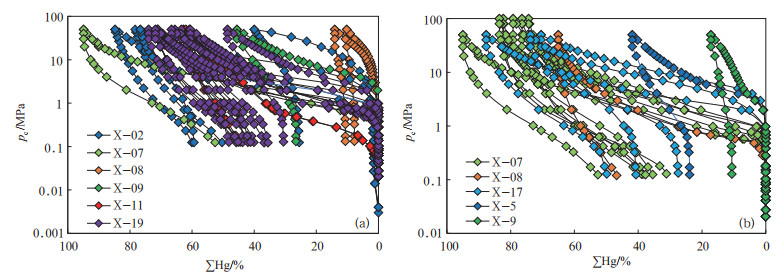 通过对研究区太原组、本溪组的高压压汞测试结果进行描述与统计分析发现(图 4),本溪组及太原组压汞曲线均呈现出一种两端较陡,主进汞阶段较为平缓,进汞时间较长的特征,且太原组相较本溪组主进汞段斜率更低,进汞时间更长。其中,本溪组最大进汞饱和度介于65.03%~87.6%,平均为76.94%,太原组最大进汞饱和度介于45.55%~ 73.99%,平均为62.67%,表明储层孔喉连通性中等,存在一定数量的孤立、无效孔隙;本溪组排驱压力介于0.50~1.97MPa,平均为1.43MPa,分选系数介于0.81~2.17,平均为1.51,太原组排驱压力介于0.14~3.77MPa,平均为1.11MPa,分选系数介于0.72~2.86,平均为1.70,储层孔喉结构相对稍差,且具有一定的非均质性;本溪组孔隙中值半径介于0.042~0.28μm,平均为0.15μm,退汞效率介于38.34%~62.85%,平均为49.42%,太原组孔隙中值半径介于0.048~0.23μm,平均为0.13μm,退汞效率介于28.43%~44.59%,平均为36.51%(表 1、表 2),储层整体孔径较小,但太原组退汞效率较本溪组更低,说明太原组孔喉分布不均。结合铸体薄片与扫描电镜观察,发现本溪组与太原组孔隙形态较为复杂,孔径均较低,主要表现出细—中喉道形态,总体上为偏细喉道型;但相比之下,太原组的孔喉结构更为复杂。