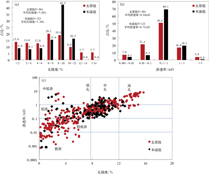图 5 鄂尔多斯盆地神府区块本溪组及太原组储层物性分布(a、b)及孔渗相关性(c) Fig. 5 Physical properties of Benxi Formation and Taiyuan Formation reservoirs in Shenfu block (a, b) and relationship between porosity and permeability (c) |