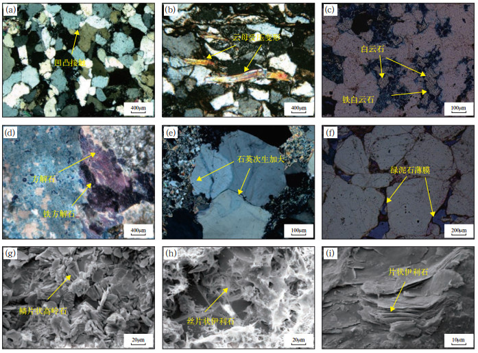 图 6 鄂尔多斯盆地神府区块太原组—本溪组成岩特征图片 Fig. 6 Diagenesis of Taiyuan Formation-Benxi Formation reservoirs in Shenfu block, Ordos Basin (a)X-09井,1909.96m,本溪组,颗粒间凹凸接触,铸体薄片,25×;(b) X-17井,2106.55m,本溪组,云母碎片定向分布,受压变形现象明显,铸体薄片,50×;(c) X-36井,2039.28m,本溪组,铁白云石胶结碎屑,白云石交代铁白云石,铸体薄片,100×;(d) X-09井,1796.99m,太原组,铁方解石和方解石胶结物,铸体薄片,100×;(e) X1-27-1D井,2156.90m,太原组,石英次生加大,铸体薄片,100×;(f) X-36井,2037.02m,本溪组,绿泥石薄膜,铸体薄片,50×;(g) X-16井,2025m,太原组,鳞片状高岭石充填粒间孔隙,扫描电镜;(h) X-16井,2023.03m,太原组,丝片状伊利石、次生加大石英和方解石充填粒间孔隙,扫描电镜;(i) X-17井,2105.11m,本溪组,丝片状伊利石胶结充填粒间孔隙,扫描电镜 |
