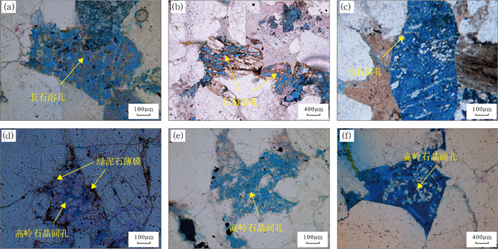 图 7 鄂尔多斯盆地神府区块太原组—本溪组砂岩溶蚀孔隙发育特征图片 Fig. 7 Development characteristics of dissolution pores in Taiyuan Formation-Benxi Formation sandstone reservoirs in Shenfu block, Ordos Basin (a) X1-27-1D井,2156.90m,太原组,长石溶孔,铸体薄片,100×;(b) X-39井,2122.63m,本溪组,长石溶孔,铸体薄片,50×;(c) X-09井,1796.99m,太原组,长石溶孔,铸体薄片,25×;(d) X-36井,2037.02m,本溪组,高岭石晶间孔和绿泥石薄膜,铸体薄片,100×;(e) X1-27-1D井,2205.60m,本溪组,高岭石晶间孔,铸体薄片,100×;(f) X-30井,2071.88m,本溪组,高岭石晶间孔,铸体薄片,100× |