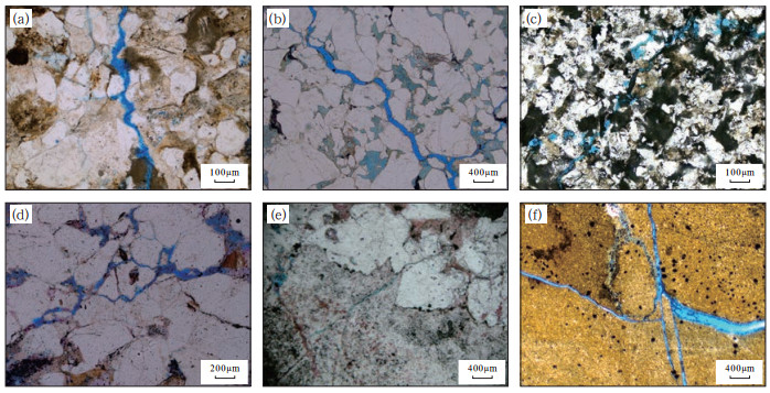 图 8 鄂尔多斯盆地神府区块太原组—本溪组砂岩微裂缝发育特征图片 Fig. 8 Development characteristics of micro fractures in Taiyuan Formation-Benxi Formation sandstone reservoirs in Shenfu block, Ordos Basin (a) X-72井,2015.35m,太原组,裂缝,铸体薄片,100×;(b) X1-27-1D井,2205.60m,本溪组,裂缝,铸体薄片,25×;(c) X-14井,2100.54m,太原组,微裂缝,铸体薄片,100×;(d) X-30井,2065.51m,本溪组,裂缝,铸体薄片,50×;(e) X-07井,2005m,本溪组,微裂缝,铸体薄片,25×;(f) X-24井,1887.65m,本溪组,裂缝,铸体薄片,25× |
