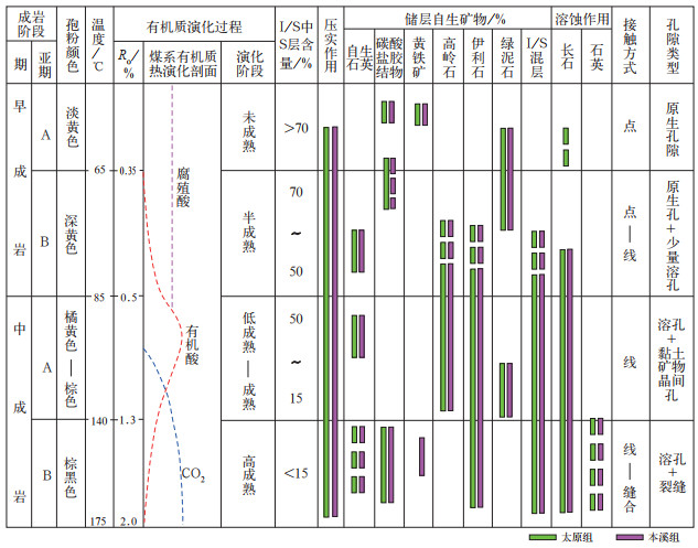 3.5 成岩阶段划分根据成岩作用与自生矿物生成次序进行分析,结合《碎屑岩成岩作用划分》标准(SY/T 5477—2024)[41],研究区太原组—本溪组的致密砂岩储层主要处于中成岩阶段B期(图 9)。