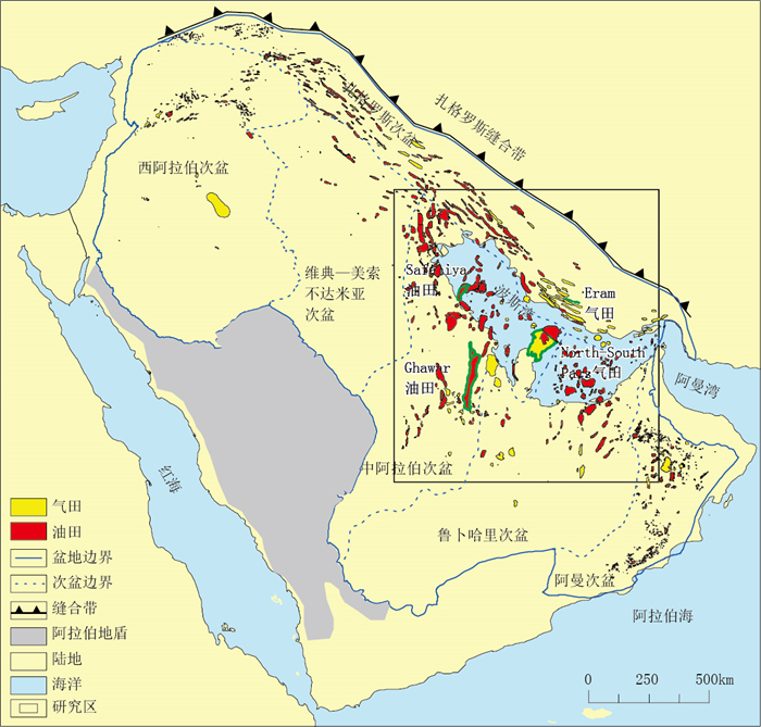 波斯湾盆地油气资源富集,已发现油气储量1.6×1012bbl油当量[1],待发现资源量5145×108bbl油当量[2],油气勘探潜力较大。波斯湾盆地古隆起处发育多个世界级大型构造油气田:中阿拉伯次盆盖瓦尔隆起处发育世界最大油田——Ghawar油田,为侏罗系背斜构造油气藏,可采储量为1676×108bbl油当量[1];卡塔尔隆起处发育世界最大的非伴生气田——North-South Pars气田,为上二叠统—下三叠统低幅背斜气藏,可采储量为4156×108bbl油当量[1];中阿拉伯次盆的波斯湾海域,发育世界最大的海上油田——Safaniya油田,为下白垩统背斜构造油气藏,可采储量为568×108bbl油当量[1]。前人研究发现,阿拉伯板块碰撞拼合过程中形成基底古隆起和基底断裂,后期古隆起继承性发育控制形成巨型低幅背斜,进而控制大型油气田的形成[3]。因此,精细识别波斯湾盆地深部古隆起并探讨其对油气分布的控制作用,是拓展波斯湾盆地深层油气勘探的关键,具有重要的理论与实践意义。