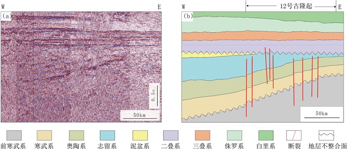 图 10 跨12号古隆起地震剖面(a)及其对应地质剖面(b)[29](剖面位置见图 9AB) Fig. 10 Seismic profile (a) and corresponding geological section (b) across paleo uplift No.12 [29] (section location is in Fig. 9AB) |