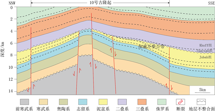 晚泥盆世—早石炭世发生海西运动,研究区基底断裂活化、基底断块隆升形成继承性古隆起,隆起核部发育寒武系—泥盆系平行褶皱,泥盆系遭受明显剥蚀,石炭系缺失,形成泥盆系Jubah组砂泥岩与上石炭统—下二叠统Unayzah组砂岩之间的区域性角度不整合面(图 11)。早二叠世,古隆起被上石炭统—下二叠统Unayzah组砂岩超覆淹没,陆续沉积二叠系Khuff组碳酸盐岩及中生界。海西运动产生的北西向挤压作用导致南北向前寒武纪基底古隆起继承性发育、规模增大,部分发生北东向旋转[10-11]。因此,北东向古隆起的定型时间为晚泥盆世—早石炭世。