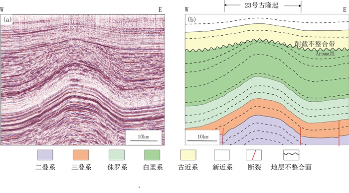 图 12 跨23号古隆起地震剖面(a)及其对应地质剖面(b)[29](剖面位置见图 9EF) Fig. 12 Seismic profile (a) and corresponding geological section (b) across paleo uplift No.23 [29] (section location is in Fig. 9EF) |