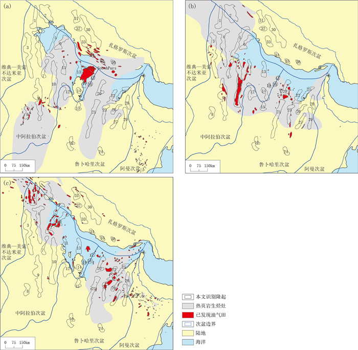 白垩系泥页岩于中晚白垩世—古新世开始生油[25, 36],晚于第1期和第2期古隆起区圈闭的形成时间。结合白垩系热页岩生烃灶的分布范围(图 13c)可知,1—2、4—7、10、20—23、25—29号古隆起为白垩系油气勘探潜力区,目前已在1、5—6、22—23、27号古隆起周缘发现多个白垩系油气藏。