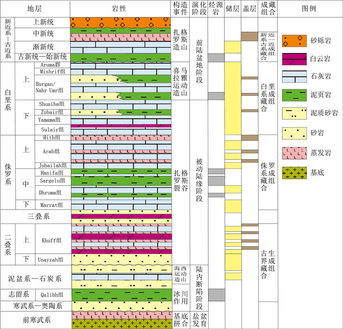 波斯湾盆地为发育在前寒武系结晶基底之上的叠合盆地,主要经历了前寒武纪—石炭纪陆内断陷盆地、二叠纪—早白垩世被动陆缘盆地和晚白垩世—新生代前陆盆地3期构造沉积演化阶段(图 3)。前寒武纪,波斯湾盆地为盐盆发育阶段[14],Najd左旋走滑形成阿曼裂谷盆地,发育陆相碎屑岩[3]。早寒武世—晚泥盆世,波斯湾盆地处于具有克拉通背景的被动陆缘早期伸展演化阶段,形成西阿拉伯、维典—美索不达米亚、中阿拉伯和鲁卜哈里次盆,以陆相碎屑岩为主[15-16]。晚泥盆世—晚石炭世海西运动导致盆地普遍缺失石炭系,发育区域性上石炭统—下二叠统Unayzah组砂岩不整合面[10, 17]。二叠纪—早白垩世,为被动陆缘晚期伸展演化阶段,以碳酸盐岩沉积为主[18]。晚白垩世—新生代为前陆盆地演化阶段,形成扎格罗斯次盆,以碳酸盐岩和膏盐岩建造为主要特征[19]。
