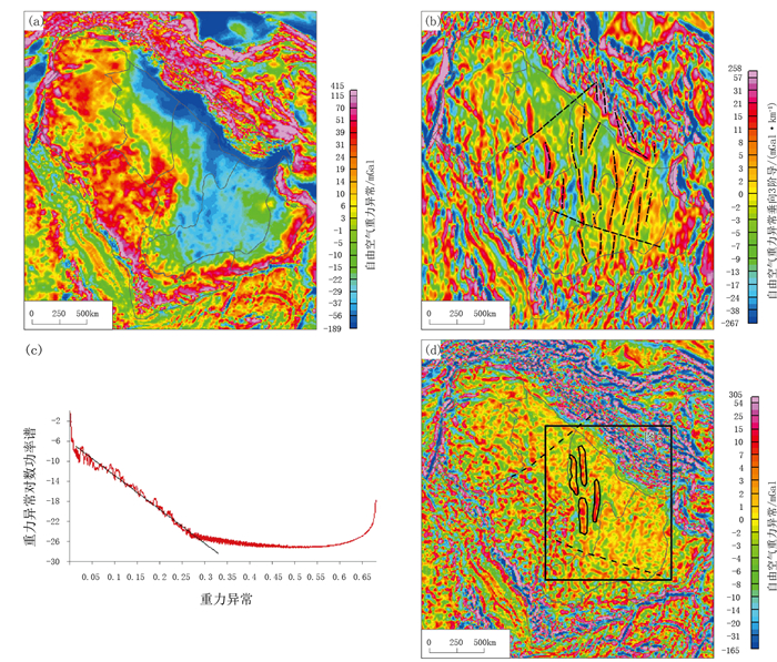 图 4 BGI自由空气重力数据基底断裂和古隆起识别 Fig. 4 Identification of basement faults and paleo uplift by BGI free air gravity data (a) BGI自由空气重力原始数据;(b) 二维小波断裂分析垂向3阶细节图;(c) 二维小波断裂分析垂向3阶细节场对数功率谱图;(d) BGI自由空气重力数据滑动平均局部场中识别的基底隆起 |