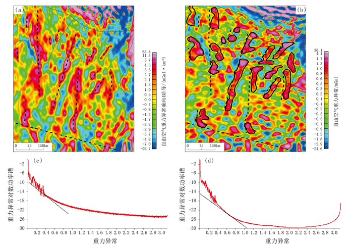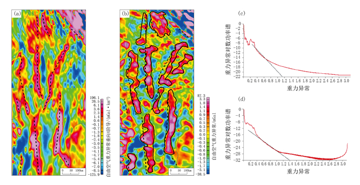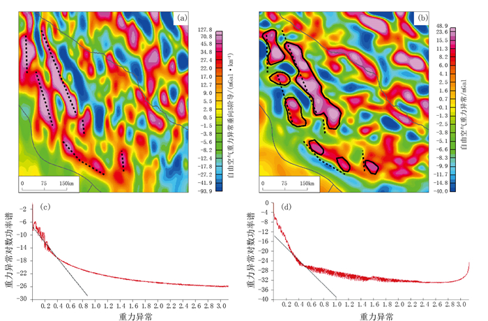 鲁卜哈里次盆东部研究范围为东经50°~56°,北纬17.5°~27.5°。EGM自由空气重力场中,东北部和西南部均为重力低异常,中部为重力高异常(图 5)。在EGM自由空气重力数据二维小波断裂垂向4阶细节图中,识别出13条南北或北东向重力高异常带(图 7a),与小波多尺度分解4阶细节图中的重力异常梯度带展布基本一致(图 7b),指示13条断裂。断裂的识别结果与BGI自由空气重力数据识别的基底断裂(场源深度为32~34km)基本一致(图 4a、c)。二维小波断裂垂向4阶细节图和小波多尺度分解4阶细节图的对数功率谱曲线揭示其场源深度均为7~8km(图 7c、d),说明断裂埋深从32~34km延伸至埋深7km左右。在EGM自由空气重力数据小波多尺度分解4阶细节图中(图 7b),沿基底断裂的展布方向识别出19个南北或北东向重力高异常圈闭,指示与基底断裂具有成因联系的古隆起。