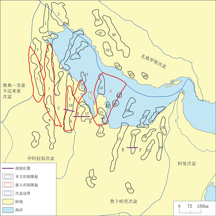 图 9 本文识别古隆起与前人已发现古隆起位置分布对比图 Fig. 9 Comparison of distribution of discovered paleo uplifts between this study and previous studies 黑色数字1—36为本文识别古隆起编号;红色数字1—5为前人已发现古隆起:1—萨曼台地;2—安纳凸起;3—盖瓦尔凸起;4—达曼凸起;5—卡塔尔凸起 |