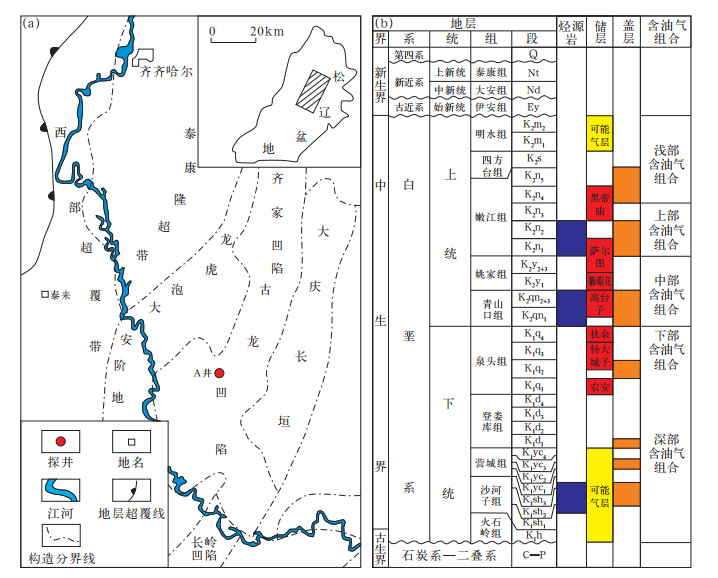 图 1 松辽盆地北部区域构造(a)及页岩油赋存层系(b)图[41] Fig. 1 Regional structure (a) and shale oil occurrence formation (b) in the northern Songliao Basin[41] |