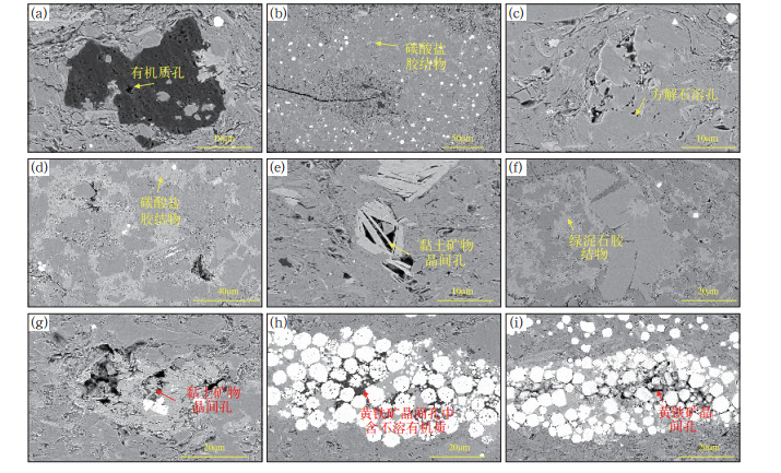 图 10 古龙凹陷A井页岩油储层扫描电镜图 Fig. 10 SEM photos of shale oil reservoirs in Well A in Gulong Sag (a) 2501.1m,有机质孔;(b) 2530.1m,长英质纹层被严重胶结;(c) 2331.1m,方解石溶孔;(d) 2367.1m,长英质纹层中方解石胶结;(e) 2458.1m,黏土矿物晶间孔;(f) 2511.1m,混合质纹层中绿泥石胶结;(g) 2333.6m,长英质纹层中绿泥石化;(h) 2526.51m,黏土矿物中黄铁矿内充满不溶有机质;(i) 2511.1m,混合质纹层中黄铁矿晶间孔发育 |