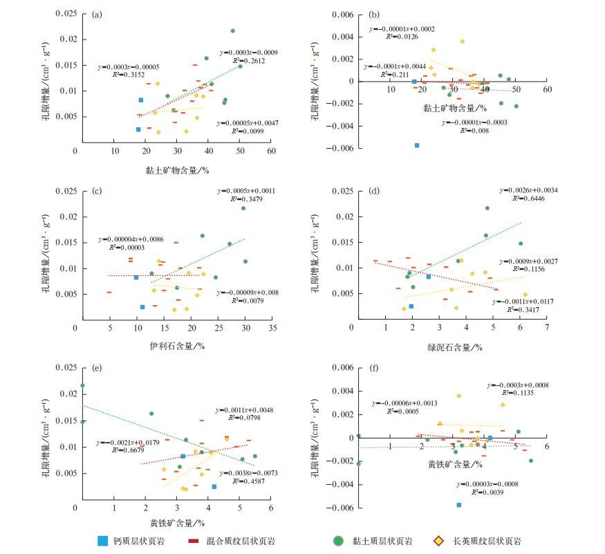 黏土矿物总量与弱极性烃占据孔隙空间在各岩相中均呈正相关关系(图 11a),与极性烃占据孔隙空间呈负相关关系(图 11b),主要由于黏土矿物成因存在差异,高TOC层状黏土(质)页岩中蒙皂石向伊利石转化,黏土矿物晶体内部层间距从1.7nm减小为1nm,晶体间孔比表面积减小,孔径增加(图 12),且伊利石含量越高,提供的孔隙量越大(图 11c),但孔径小,重质组分易堵塞孔隙喉道,造成孔隙减少(图 11d)。在中—高TOC纹层状混合质页岩中,伊利石和绿泥石与弱极性烃占据孔隙空间呈负相关关系(图 11c、d),主要由于中—高TOC纹层状混合质页岩中发育绿泥石和伊利石胶结物(图 10f),抑制烃类充注,弱极性烃占据孔隙空间减少。在低TOC纹层状长英质页岩中,绿泥石与弱极性烃占据孔隙空间呈较弱的正相关关系(图 11d),主要是由于低TOC纹层状长英质页岩中的长石矿物部分发生绿泥石化,形成次生孔隙,为弱极性烃提供了少量的储集空间(图 10g)。蒙皂石向伊利石转化的过程中会形成自生石英,这会导致高TOC层状黏土(质)页岩中的石英含量有所增加,但是这些自生石英是分散分布在黏土矿物中的[43],几乎不会增强页岩的脆性,因此高TOC层状黏土(质)页岩可以成为资源甜点,即使石英矿物含量增高也无法成为工程甜点。