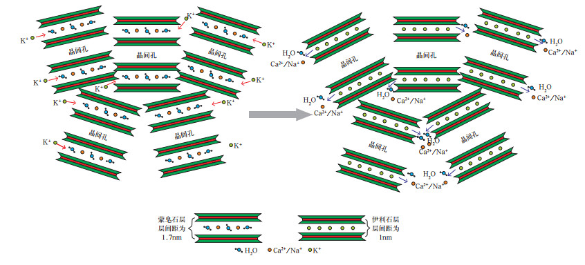 图 12 蒙皂石向伊利石转化增孔模式图 Fig. 12 Pore increment pattern after the conversion of montmorillonite to illite |
