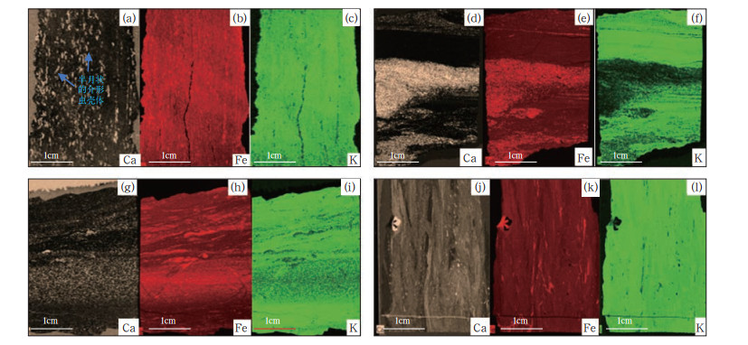 图 2 古龙凹陷页岩油岩相元素分布图(A井)[42] Fig. 2 Element distribution of Gulong shale oil with various lithofacies (Well A)[42] (a—c)2484.1m,高TOC层状黏土(质)页岩;(d—f)2347.1m,中—高TOC纹层状混合质页岩;(g—i)2337.1m,低TOC纹层状长英质页岩;(j—l)2329.15m,层状钙质页岩;黄色为钙元素Ca,红色为铁元素Fe,绿色为钾元素K |