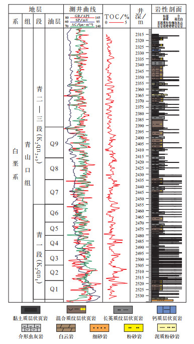 在古龙凹陷不同层段4类岩相分布存在一定差异(图 3),Q9油层及以上地层中发育中—高TOC纹层状混合质页岩和纹层状长英质页岩,Q9底部和Q8发育低TOC纹层状长英质页岩和高TOC层状黏土(质)页岩,Q7中上部发育中—高TOC纹层状混合质页岩和低TOC纹层状长英质页岩,Q7中下部和Q6中上部发育高TOC层状黏土(质)页岩,Q5和Q6底部发育中—高TOC纹层状混合质页岩和少量低TOC纹层状长英质页岩,Q2至Q3发育高TOC层状黏土(质)页岩,Q1发育中—高TOC纹层状混合质页岩。