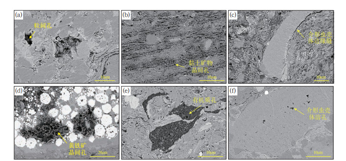 图 4 古龙凹陷页岩油储层孔隙类型图(A井) Fig. 4 Pore type of shale oil reservoir in Gulong Sag (Well A) (a) 2333.6m,粒间孔;(b) 2511.1m,黏土矿物晶间孔;(c) 2484.1m,介形虫壳体边缘缝;(d) 2497.1m,黄铁矿晶间孔;(e) 2501.1m,有机质孔;(f) 2522.1m,介形虫壳体溶孔 |