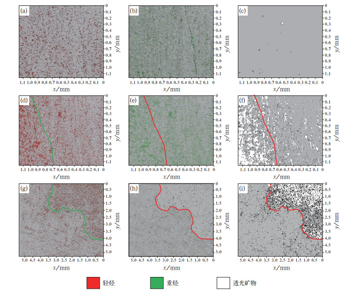 3.1 纹层间差异聚集特征激光共聚焦显微镜拍摄图像显示高TOC层状黏土(质)页岩轻烃(占样品总体积的14.36%)和重烃(占样品总体积的12.36%)呈斑点状分散在整个样品之中,轻重比接近1∶1,彼此之间连通性较差,在局部页理缝发育部位呈连续线状分布(图 5a—c)。中—高TOC纹层状混合质页岩轻烃(占样品总体积的12.16%)在整个样品中均有分布,在含有介形虫壳体的混合质纹层中含量略高,单个烃类聚集区域面积较大,重烃(占样品总体积的9.71%)主要分布在黏土质纹层中,在混合质纹层中重烃分布范围小于轻烃,局部重合,轻重比为1.25,轻重比随着混合质纹层在样品中比例增加而增大(图 5d—f)。低TOC纹层状长英质页岩轻烃(占样品总体积的9.71%)主要集中在长英质纹层之中,在黏土质纹层中只有少量分布,重烃(占样品总体积的5.61%)只在黏土质纹层中少量分布,在长英质纹层中几乎无重烃,轻重比为1.73,但该类岩相轻烃含量总体较少,且极易挥发,含油量明显低于前两类页岩(图 5g—i)。