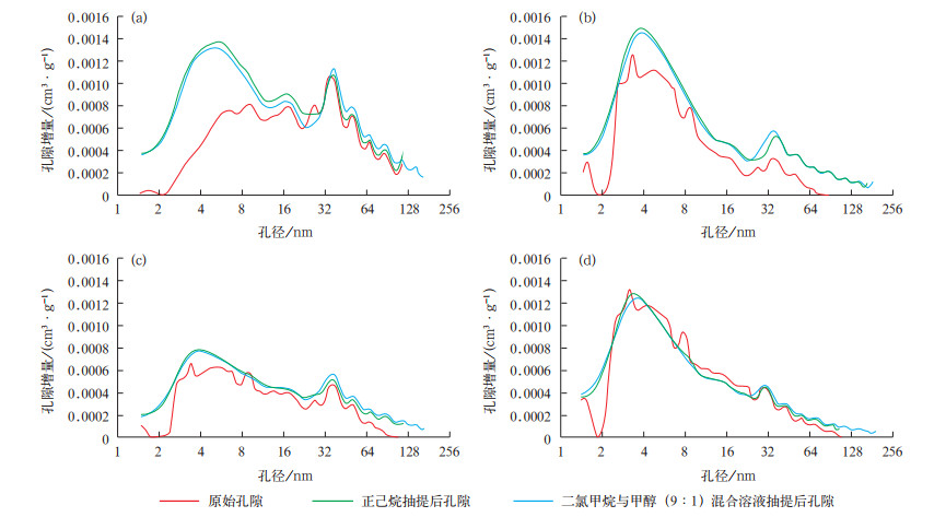综合正己烷和二氯甲烷与甲醇(9∶1)混合溶液分别抽提后的样品孔径变化,4类岩相均具有正己烷抽提后新增孔隙量大,二氯甲烷与甲醇(9∶1)混合溶液抽提后新增孔隙量小甚至变为负值的现象,表明弱极性烃占据了主要的孔隙空间,而极性烃只占据了少量的孔隙空间。高TOC层状黏土(质)页岩总孔隙量和饱和烃含量大,主要赋存于小于32nm的孔隙,二氯甲烷与甲醇(9∶1)混合溶液抽提后,小于32nm的孔隙体积略有减小,可能由不溶物移动堵塞小孔隙造成,大于32nm的孔隙体积略有增加,极性烃排出同时不溶物移动未造成大孔堵塞。中—高TOC纹层状混合质页岩饱和烃总量中等,大量赋存于小于8nm和大于64nm孔隙,二氯甲烷与甲醇(9∶1)混合溶液抽提后孔隙几乎无变化,仅在32nm左右的孔中略有增加。低TOC纹层状长英质页岩总孔隙体积和饱和烃含量小,主要赋存于大于64nm的孔隙,少量赋存于小于8nm的孔隙,二氯甲烷与甲醇(9∶1)混合溶液抽提后仅在大于32nm的孔隙中略有增量。钙质页岩基本不含烃类,两次抽提仅有大于64nm的孔隙略有增加。